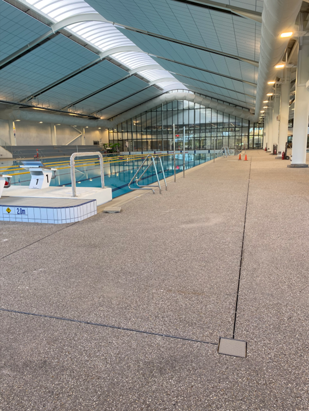 The centre was designed with numerous walking surfaces positioned adjacent to the various wet areas. For patron safety, these floors require effective drainage without the use of large grating inlets. Aesthetically, designers wanted a discreet linear drain system that could be visually integrated with the floor design. To deal with the caustic chemicals used in the cleaning agents, there was also a requirement for these drains to be durable.